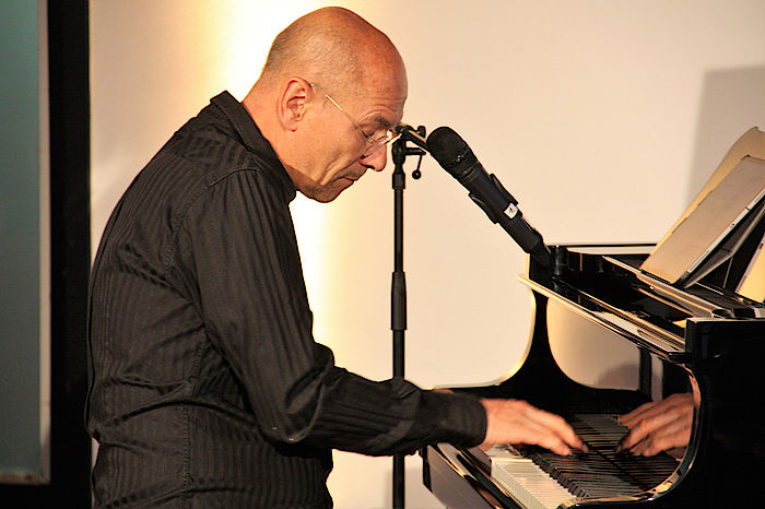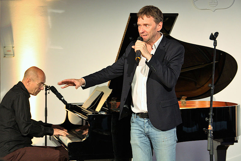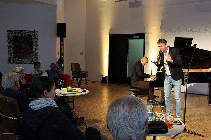 „Blattgold“ soll im übertragenen Sinne das widerspiegeln, was das Leben so treibt, in aller Schönheit, bewusst geschönt aber auch mit der Tatsache seiner Vergänglichkeit. Alles verpackt in stilvoller Sprache, in allegorischen Bildern mit einem gewissen feinen Humor und klarer Ansage. „Du bist ein Mensch und suchst Gesichter, hinter dem Blattgold dieser Zivilisation. Du findest Verpflichter und Verzichter, und als Trostpreis Illusion.“ Mit dem Titelsong des neuen Albums eröffneten die beiden Spitzenmusiker ihren Konzertabend, der für die anwesenden Zuschauer ein Kulturgenuss werden sollte. Von der Qualität der sanften Klaviermusik von Andy Lutter bis hin zur facettenreichen, teils improvisatorischen Stimme Ecco Meinekes, der sie auch für Rhythmus-Elemente einsetzte, war es ein Hörgenuss. Größtenteils sind die Lieder auf dem neuen Album aus der eigenen Feder aber auch von den großen Chansonniers Georg Kreisler („Mein Weib will mich verlassen – hoffentlich“) und Charles Aznavour („Sie“).