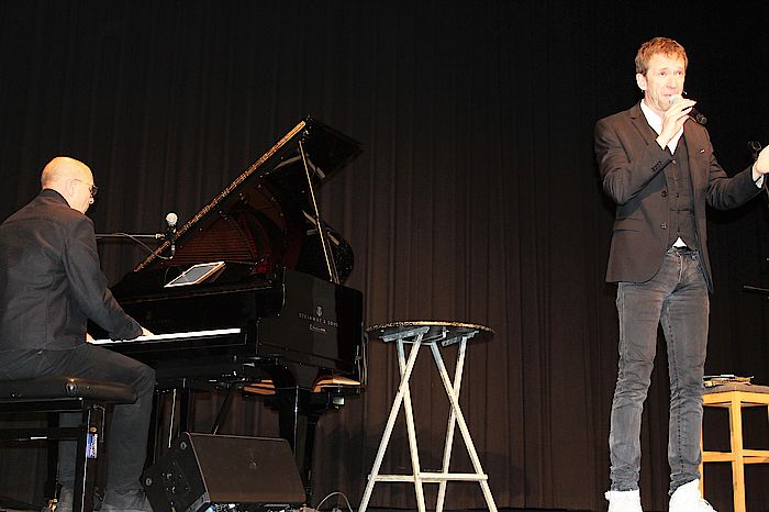 Wolfratshausen, 4.5.2018 – Humoristische und musikalische Leckerbissen servierten Ecco Meineke und der Pianist Andy Lutter den Besuchern des kabarettistischen Frühschoppens in der Loisachhalle. Die dabei präsentierten Lieder fügten sich harmonisch in Meinekes Soloprogramm „Das Thema ist gegessen“ ein.