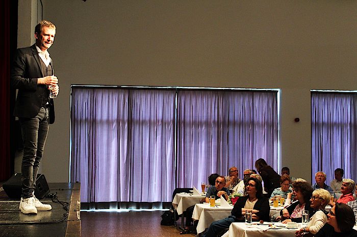 Ob Überangebot und Personalmangel in den Supermärkten, genmanipuliertes Essen oder die Vermarktungstricks einer bekannten Fast-Food-Kette: Ecco Meineke – einst Mitglied und Autor des Ensembles der „Münchner Lach- und Schießgesellschaft“ – schaffte den Spagat, diese Missstände in witziger und kurzweiliger Weise ins Lächerliche zu ziehen. Gewürzt wurde das Kabarettprogramm mit souverän interpretierten Musikstücken. Begleitet von dem renommierten Pianisten Andy Lutter interpretierte Meineke eine Nat-King-Cole-Jazz-Nummer genauso elegant wie die Billy-Joel-Coverversion „Abtauen, Girl!“ oder die Umsetzung des Charles-Aznavour-Chansons „Sie“. Das hätte gut in das gelassene Ambiente eines Wiener Kaffeehauses gepasst. Und in der Tat zogen viele Besucher den koffeinhaltigen Muntermacher alkoholhaltigen Getränken vor. Dazu wurden Weißwürste oder Obazda serviert.