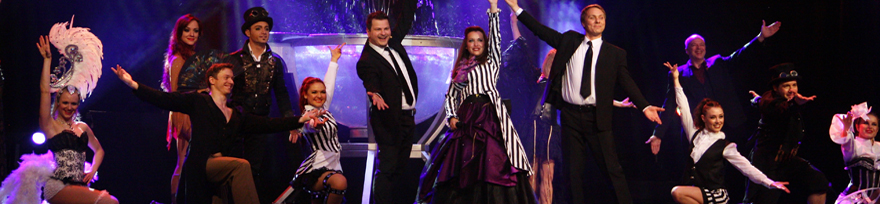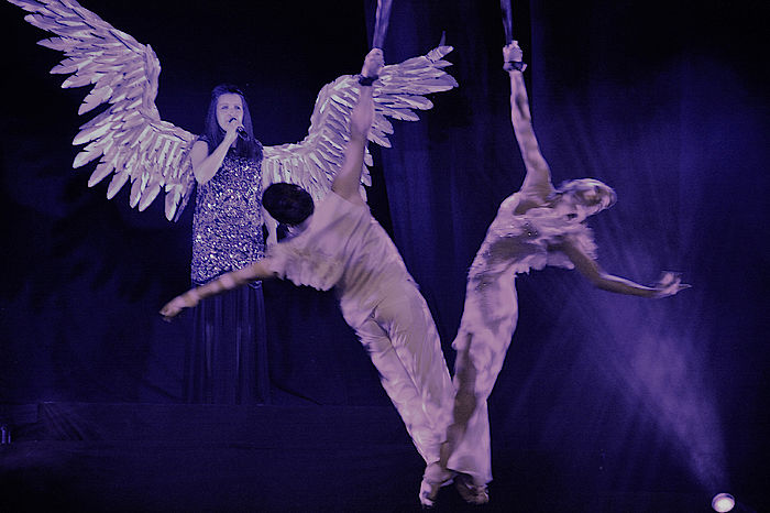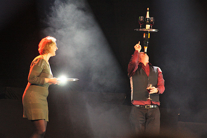Die imaginäre Revue begann mit einem „Sky Walk“. Halamek schwebte mit Artistin Svetlana Wottschel anmutig am vertikalen Seil durch die Lüfte, untermalt von der berühmten James-Bond-Melodie. Der englische Komödiant Steve Rawlings zündelte mit Feuerkeulen, jonglierte mit Wiener Kaffeehausstühlen und holte sich eine Assistentin aus Reihe eins, die im behilflich sein sollte, Champagnerflaschen und gefüllte Rotweingläser auf der Kinnspitze zu balancieren. Zauberei, Glitzerwelt, Lichtershow und mittanzen. Das Publikum war gefordert, all die Eindrücke aufzunehmen. Ruhe ins Geschehen brachten Franziska Sporer aus Geretsried mit Ihrer Gesangsstimme und Max Merseny am Saxofon.