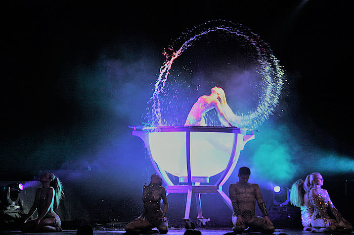 Den Tanz der glitzernden Glaskugeln präsentierte Kelvin Kalvus, ein mystischer Kahlkopf im Gewand eines mongolischen Kriegers. Unumstritten der Höhepunkt des Abends war der „Water Bowl“, eine spektakuläre Nummer von Artistin Svetlana Wottschel präsentiert. Wie ein Goldfisch im Becken tauchte sie ab, um dann mit spritzender Wasserfontäne aus Haar und Körperbewegung wieder hervor zu preschen. Spektakulär hat die Show begonnen. Spektakulär endete die Suche nach dem Glück. Das Publikum dankte Dominik Halamek und seinen hochkarätigen Künstlern mit stehender Ovation.