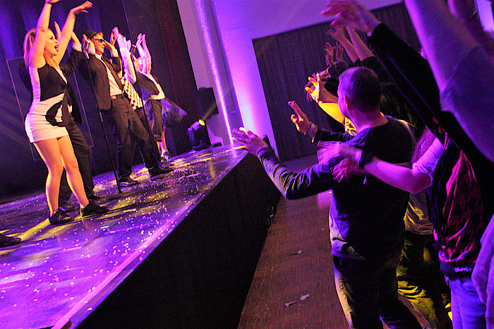 Blaue Leuchtpyramiden säumten den Eingang als Spalier. Innen illuminierten bunte Lichterringe durch den Saal. Im Foyer, hinterm Perlenvorhang, speisten Publikumsgäste, die erstmals das Angebot eines dazugehörigen Abenddinners nutzten. Schließlich gehört auch der Gaumenschmaus zum Glücksgefühl.