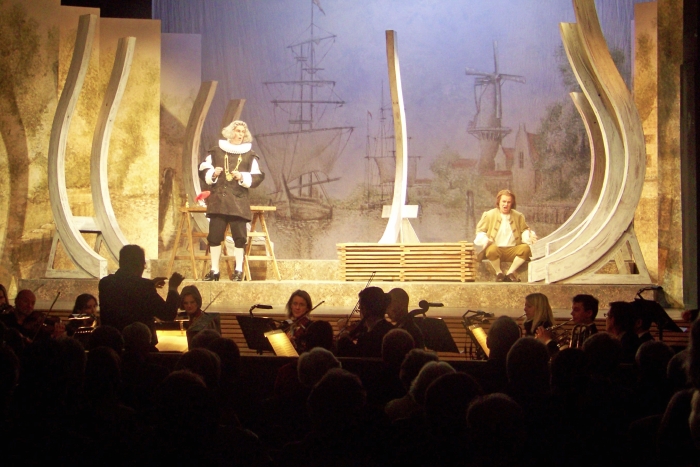 Doch was ist ein gutes Drehbuch ohne die talentierten Darsteller, die ihm Leben einhauchen? Zweifellos ein Glanzlicht des Abends ist Matthias Degen als Bürgermeister van Bett, der mit Rouge bepudertem Gesichts und graumelierter Perücke gekrönt das Lied „Oh Sancta Justitia!“ in einen Spiegel hineinsingt: „Oh, ich bin klug und weise und mich betrügt man nicht.“ Immer wieder scheitert er bei dem Versuch, sich durch die Verwendung lateinischer Redewendungen intelligenter dastehen zu lassen, als er ist, und jeder Versuch ist eine zielsichere Attacke auf das Zwerchfell: Der springende Punkt „Kasus knaxus“ wird durch ihn zu „Kausakus knusus“ und als ihn ein Brief erreicht, in dem ein gewisser Peter gesucht wird, kommentiert der Bürgermeister dies mit den Worten: „Ich denke, in diese Sache ist eine wichtige Person verwickelt. Vielleicht sogar ein Destillateur!“ Nun lässt er die Besitzerin der Schiffswerft, die Witwe Browe, ihre Angestellten versammeln, mit den Worten: „Dann schafft sie her! Tuttifrutti!“