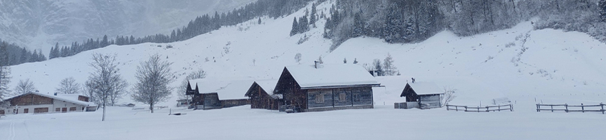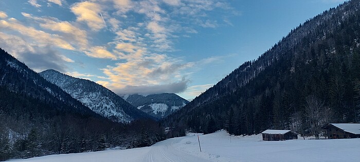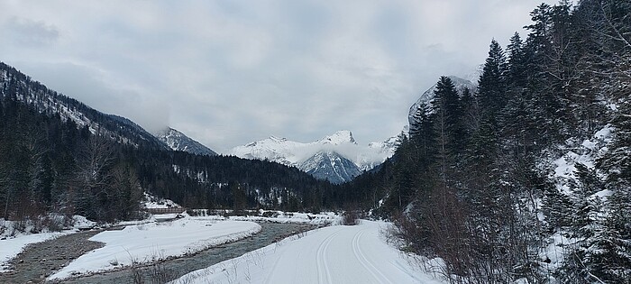 Die Loipe in die Eng ist nur für Langläufer in klassischer Technik gespurt. Eine Skatingstrecke gibt es nicht. Für die Präparierenden steht eine Einwurfkasse an der Strecke bereit. Los geht es südöstlich von Hinterriß erst einmal flach über freie Wiesen und am Rissbach entlang. Schließlich geht es immer wieder etwas bergan. An die 300 Höhenmeter weiter bergauf als Hinterriß stehen die Gebäude des Almdorfs im Großen Ahornboden.