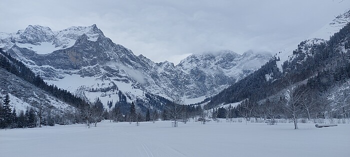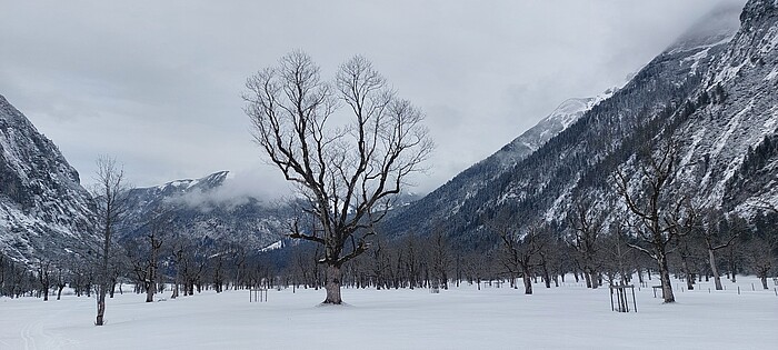 Kurz vor Loipen-Halbzeit geht es in den Großen Ahornboden hinein. Vor allem schneebedeckt bieten die teils alten Baumriesen einen einmal ganz anderen Charakter, kommen die meisten Ausflügler doch wegen der Laubfärbung im Herbst dorthin. Wer etwas zu essen oder zu trinken eingepackt hat, kann sich nun für die zweite Halbzeit auf der Loipe stärken.
