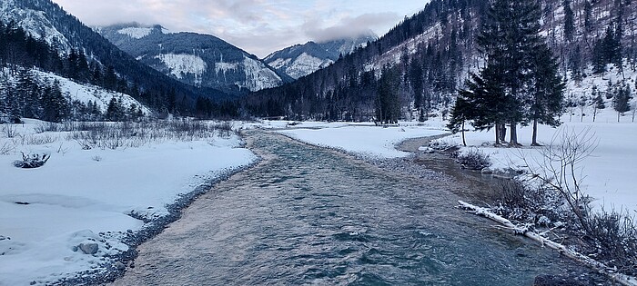 Hinterriß ist die einzige sommers wie winters dauerhaft bewohnte Siedlung im Karwendel – und eine Tiroler Enklave im nur von bayrischer Seite aus zu erreichenden österreichischen Gemeindegebiet von Vomp und Eben. Einst war die Region als Bergbau, viel mehr noch als Jagd- und Forstwirtschaftsgebiet bedeutend. Inzwischen zieht es die Gäste wegen der imposanten Natur in den Naturpark Karwendel. Der umfasst 739 Quadratkilometer, ist damit das größte Schutzgebiet Österreichs. Dort gedeihen seltene Pflanzenarten, finden besondere Tiere wie der Steinadler ihren Rückzugsort.