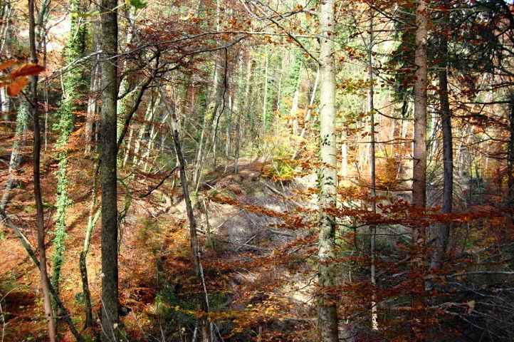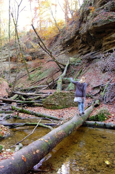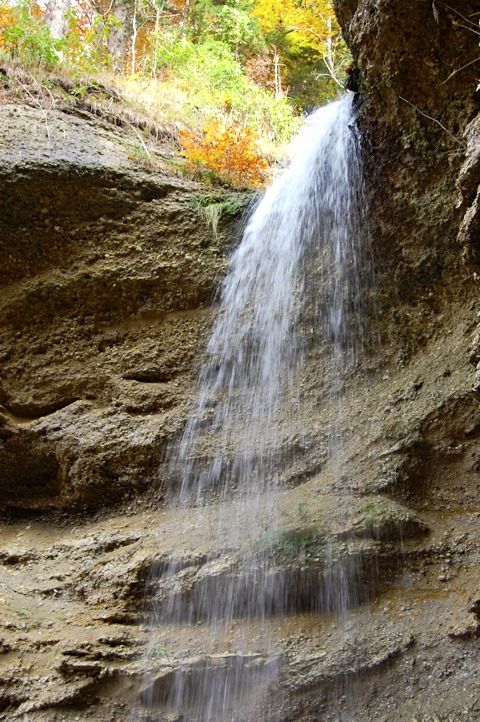 Bachaufwärts rechts ist irgendwann Schluss. Von den kreuz und quer liegenden Bäumen haben sich noch nicht viele abschrecken lassen – es ist ein Spaß, durch die Äste zu kraxeln und den kürzesten oder abenteuerlichsten Weg durchs liegende Gehölz zu suchen. Irgendwann aber ist die Wand der Schlucht zu steil als dass man ihr noch länger genügend Trittfläche abtrotzen könnte. Der Sprung über den Bach (für Sportliche), ein geschickt über den Bach geworfener Ast (für Balance-Künstler) oder ein paar Schritte durchs Wasser (für Raubeinige) verlagert die Tour auf die linke Bachseite. Vorbei an sagenhaften Höhlen und abenteuerlich aus der Steilwand ragenden Bäumen geht die Reise – bis das Tal eine letzte Kurve macht. Das Wasser rauscht mit einem beachtlichen Geräuschpegel die Wand hinaub und zaubert an sonnigen Tagen kleine Regenbogen vor die Steilwand. Spätestens jetzt muss jeder Schritt sitzen, Unaufmerksamkeiten können richtig gefährlich sein. Vor allem im Winter sind Steigeisen an dieser Stelle Pflicht. Zum Glück ist Herbst, die Blätter haben einen dichten Teppich über die Kiesbänke gelegt und malen den Boden der felsigen Schlucht rotgelb aus.