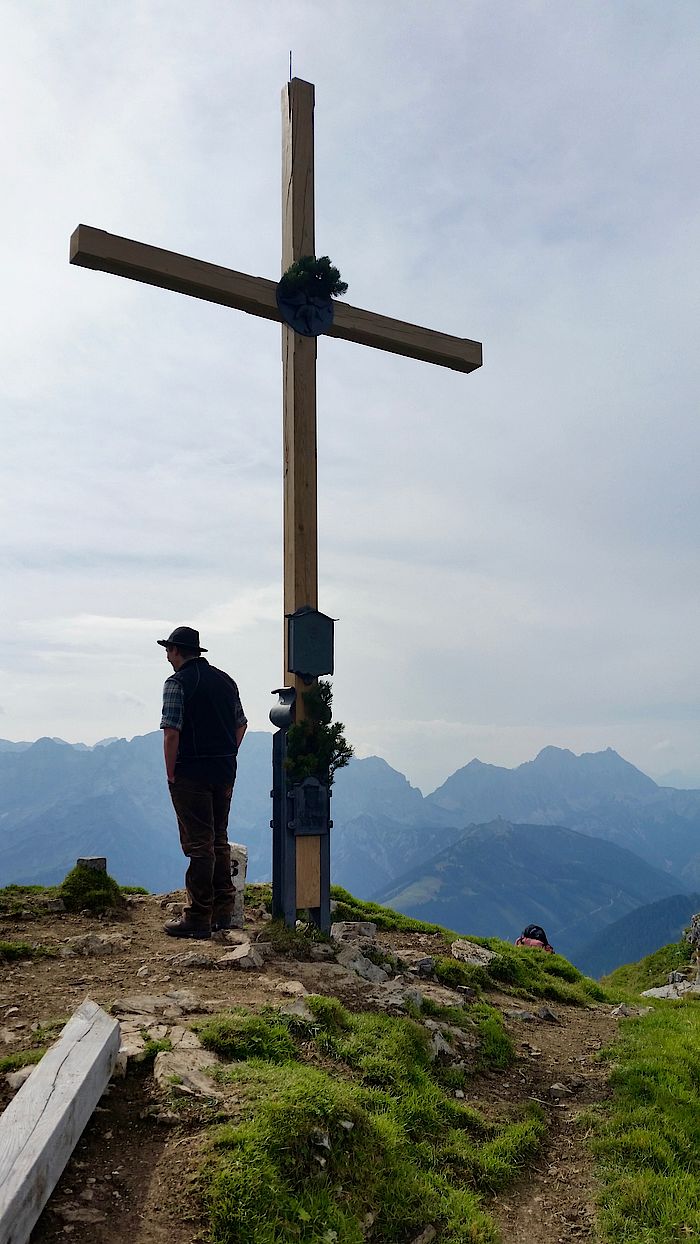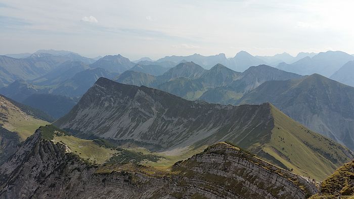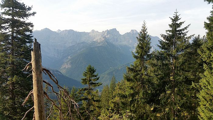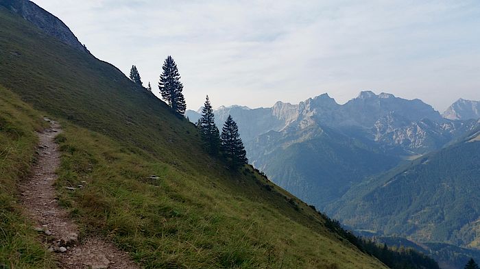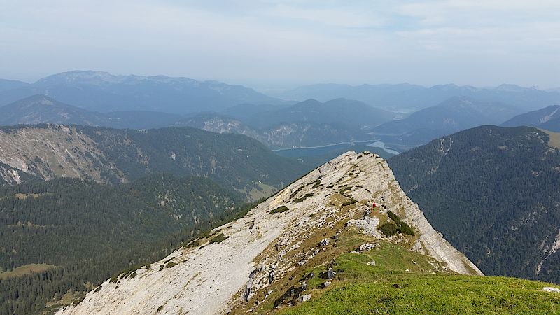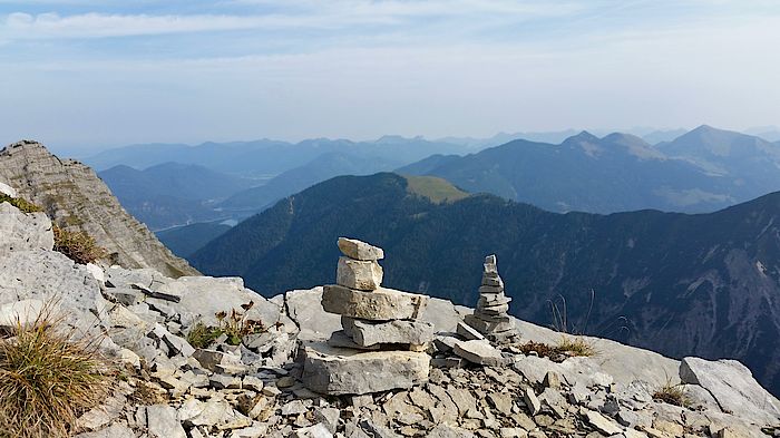 Hinter der Tölzer Hütte führt der Steig etwa eine Stunde lang weiter bis zum Gipfel. Durch Latschen geht es hinauf bis zum Grat, an Steinmandeln vorbei in die Flanke des Gipfels. Dort ist im felsigen Gelände etwas Trittsicherheit und Kraxelei erforderlich. Doch Seile und Draht bieten guten Halt. Dann ist der Gipfel erreicht. Von oben bietet sich ein prächtiges Panorama in alle Richtungen. Und außerdem können die Wanderer mit einem Schritt von Bayern nach Tirol wechseln. Denn genau am Gipfel verläuft die Landesgrenze zwischen Deutschland und Österreich.
