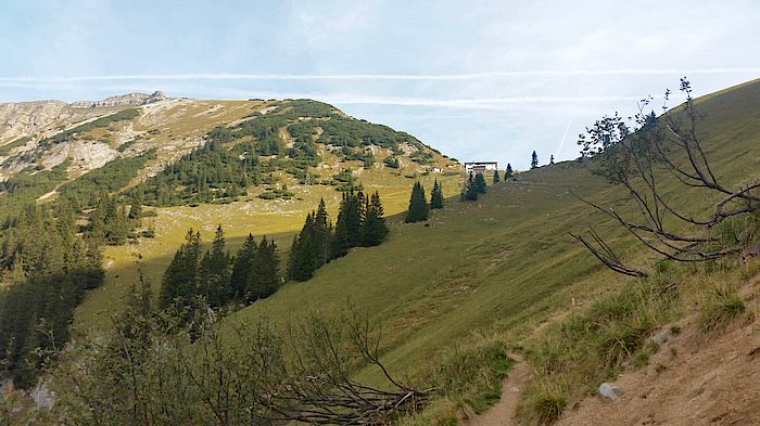 Eine Aufstiegsvariante führt vom Parkplatz bei der Oswaldhütte über die Moosenalm hinauf auf den Gipfel. Doch Ausgangspunkt dieser Tour ist der Parkplatz auf der linken Straßenseite etwa 500 Meter südlich der Jausenstation Kaiserhütte auf der Straße nach Hinterriß.