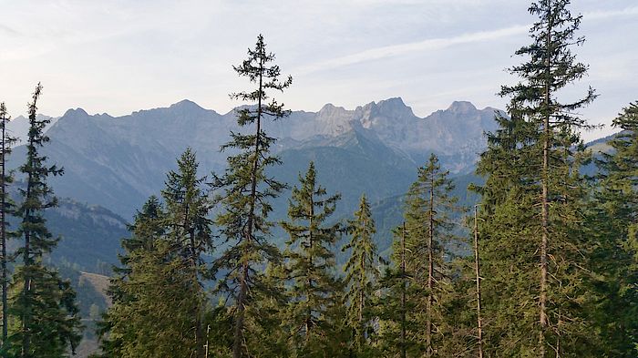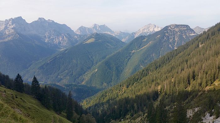 Die Wanderer folgen vom Parkplatz den Hinweisschildern zur Tölzer Hütte auf der Forststraße mit mäßiger Steigung. Doch schon nach kurzer Wegstrecke zweigt links ein schmaler Steig ab. Stetig schlängelt sich der Weg in langen Kehren durch lichten Bergwald. Immer wieder ragen bizarr-verformte Baumstümpfe empor. Schon bald rücken die großen Karwendelgipfel ins Sichtfeld, etwa die imposanten Felszacken der rund 2500 Meter hohen östlichen Karwendelspitze und der Vogelkarspitze. Hermann von Barth bestieg beide Gipfel so wie viele andere im Karwendel erstmals vor 146 Jahren. Der Alleingänger erkundete im Sommer 1870 insgesamt 88 Gipfel und machte sich als Erforscher des Karwendel-Gebirges einen Namen. Im kleinen Ahornboden erinnert ein Denkmal an Hermann von Barth.