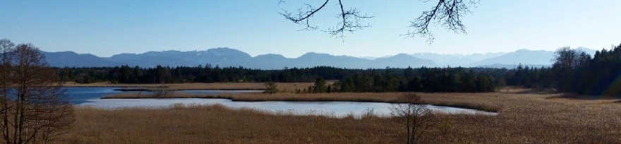 Vom ersten erhöhten Aussichtspunkt geht es nun erst einmal über Treppen den Hang hinunter Richtung Westen. Kaum ist die Senke erreicht führt der schmale Wiesenweg auch schon wieder bergan. Auf der Hangkante über dem nördlichen Ufer des Gartensees geht es weiter Richtung Westen. Der Weg bildet einen idealen Aussichtsbalkon für reizvolle Blicke nach Süden. Der Blomberg und die Benediktenwand sind ebenso zu sehen wie Jochberg, Herzogstand und Heimgarten. Und in der Ferne blitzen die majestätischen Gipfel des Karwendelgebirges hervor. Rechts des Weges stehen die äußersten Häuser von Seeshaupt.