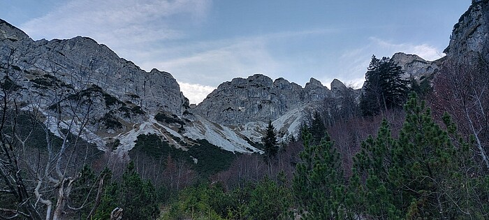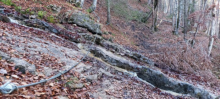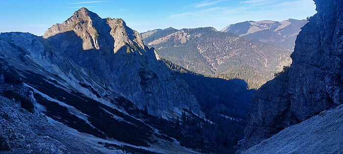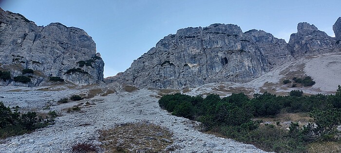 Durch die Latschen geht es weiter erst einmal bergab und durch eine seilgesicherte Felsrinne. Schließlich quert der Weg zum Sattel oberhalb des Schindertors. Dort hinab geht es seilgesichert bis zum Tor. Ein kurzer Felsabsatz ist nun auf Tritten und Eisenklammern und einer gerade für einen Fußtritt ausreichenden Einkerbung im Stein zu überwinden. Anschließend geht es den Markierungen folgend im Kar hinab. Etwas anstrengend ist das.