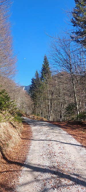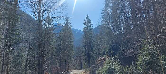 Zunächst führt die Route auf asphaltierter Straße in südwärts Richtung Dürrachtal. Am Abzweiger zum Krottenbachtal halten sich die Wanderer rechterhand. Jetzt beginnt ein Forstweg, der sich den Hang erst südlich hinaufzieht und dann nach Westen schwenkt. Oberhalb der Krottenbachklamm bewegen sich die Ausflügler nun. Für an bayerischer Heimatliteratur Interessierte sei gesagt, dass das alles praktisch „Jäger von Fall“-Terrain ist. Ludwig Ganghofer hat den gleichnamigen Roman über die Liebe und die Wilderei 1883 veröffentlicht.