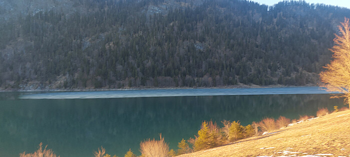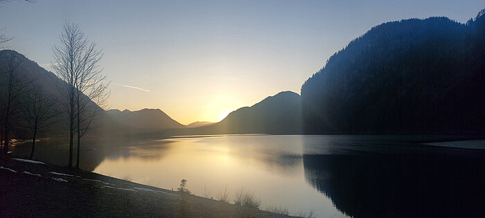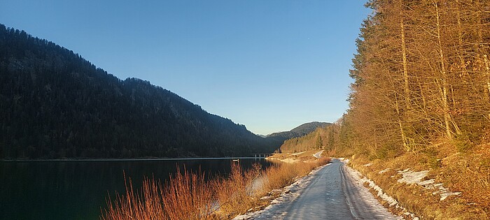 Ab jetzt geht es nur noch auf einem Forstweg teils steiler werdend hinab. Grün blitzt das Wasser des Sylvensteinspeichers zwischen den Bäumen hervor. Unten angekommen heißt es, bis zur Bundesstraße zu gehen. Die queren die Wanderer , um nach wenigen Metern einen Weg zu erreichen, der direkt an das Ufer des Sylvensteinspeichers führt. Immer am Wasser entlang geht es nun ostwärts bis kurz vor die Autobrücke. Die Wanderer biegen nach rechts ab, queren die Bundesstraße erneut und gehen auf der gegenüberliegenden Straße bis zum Wanderparkplatz zurück.
