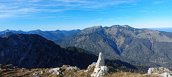Steil geht es weiter durch Wald in stetigem Zick-Zack, ehe eine schöne Lichtung erreicht ist. Die erlaubt freien Blick auf das gegenüberliegende Trainsjoch und nordwärts wieder auf den Traithen. Es geht wieder in den Wald. Währenddessen wird mehrmals eine breitere Forststraße gequert (Auf die Markierungen achten). Das Gelände lichtet sich und gibt den Blick auf mehr Berge frei. Im Nordwesten ist nun etwa auch der Brünnstein mit seinem felsplateauartigen Gipfelaufbau auszumachen.