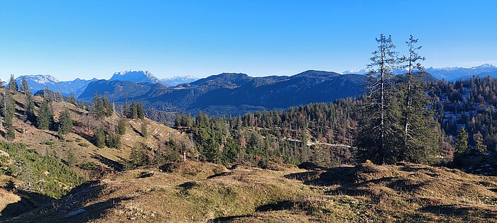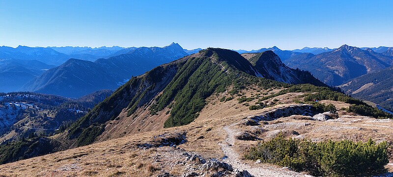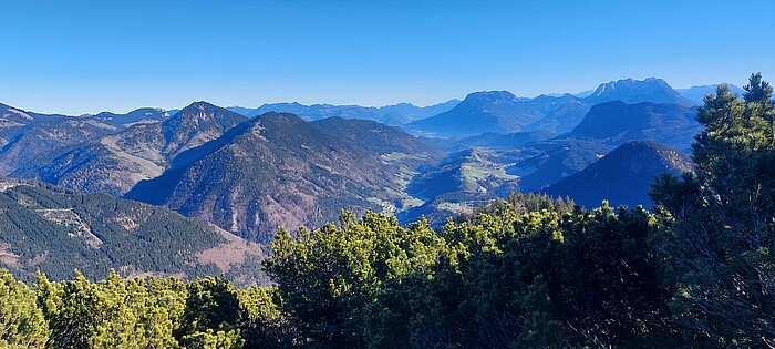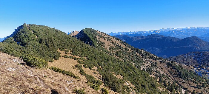 Die Aussicht wird oberhalb der Veitsbergalm nun mit jedem Schritt weiter. Über den breiten, offenen Südwesthang führt nun ein Pfad in Serpentinen bergwärts. Oben angekommen, wartet nur noch der latschenbestandene Gipfelgrat Richtung Westen, bis der Veitsberg mit dem Kreuz erreicht ist. Jetzt rückt im Norden der gesamte Gipfelkamm mit dem Hinteren Sonnwendjoch als höchstem Gipfel des Mangfallgebirges ins Panorama. Am Horizont grüßt der Wendelstein, Schinder und Guffert liegen weiter im Westen. Wer sich gegen Süden umdreht, sieht auf die Bergketten bis zum Alpenhauptkamm mit Großglockner und Großvenediger. Im Osten zeigen sich nun der Wilde und Zahme Kaiser in voller Pracht. Zeit für eine ausgedehnte Pause.