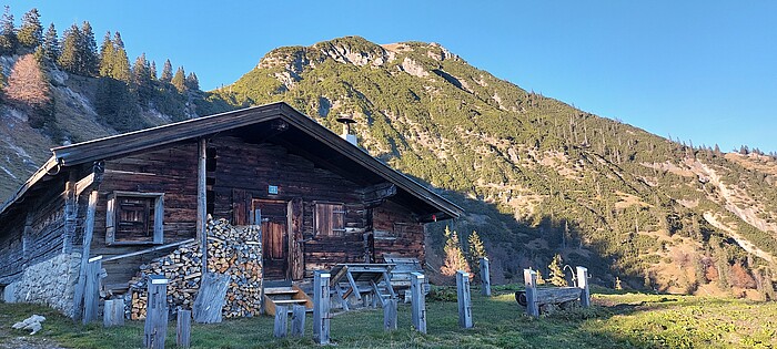 Wen es danach wieder sofort ins Tal zieht, kann den Veitsberg nach Westen überschreiten und in die Senke vor dem Frechjoch absteigen. Steiler geht es auf dem Pfad über die Almwiesen hinab zur Riedebenalm. Weiter führt die Tour durch Buchenwald hinab, bis ein breiterer Forstweg erreicht ist. An der Abzweigung geht es linkerhand wieder zum Ausgangspunkt zurück. Daneben fließt der Fürschlachtbach talwärts.
