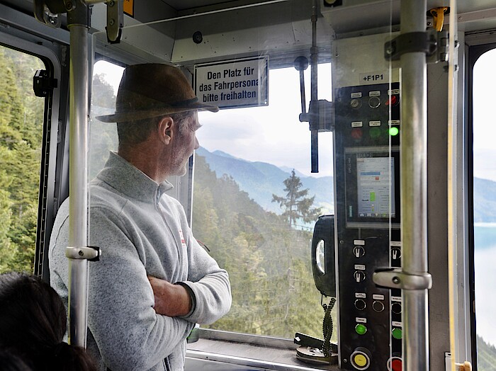 Die Kälte im Winter sei teilweise "heftig", sagt Blessing, sei ihm aber im Vergleich zur Hitze im Sommer fast lieber, denn gegen Letztere könne man nichts tun: "Die Passagiere stehen nur vier Minuten in der heißen Kabine, der Bergbahnführer dagegen teilweise den ganzen Tag." Die Druck-veränderung vom Tal zum Berg und retour sei schon bei normaler Witterung eine Belastung für den Kreislauf: "Dass ich gerne Bergtouren mache und öfter Kajak fahre, hilft als Training bestimmt". Die Belegschaft müsse ihre Fitness auch regelmäßig mit Belastungs-EKGs beim Betriebsarzt nachweisen, übergewichtig sei da keiner; dazu komme ja auch noch, die knapp einen Kilometer lange und rund 60 Meter breite Lifttrasse immer wieder freizuschneiden - bei bis zu 88 Prozent Steigung. Trotz Hitze, Kälte oder Steigung: Dass man bei der Herzogstandbahn in der Natur arbeite, sei definitiv ein Entscheidungskriterium gewesen; und hätte ihn beflügelt: "Mit dem Bergwan-dern habe ich erst angefangen, als ich hier schon dabei war - die Freude daran kam mit den tägli-chen Erlebnissen und das hat sich bis heute nicht verändert."