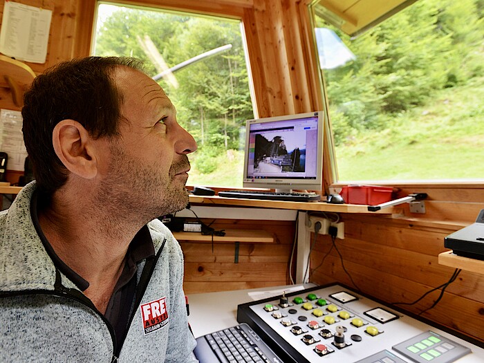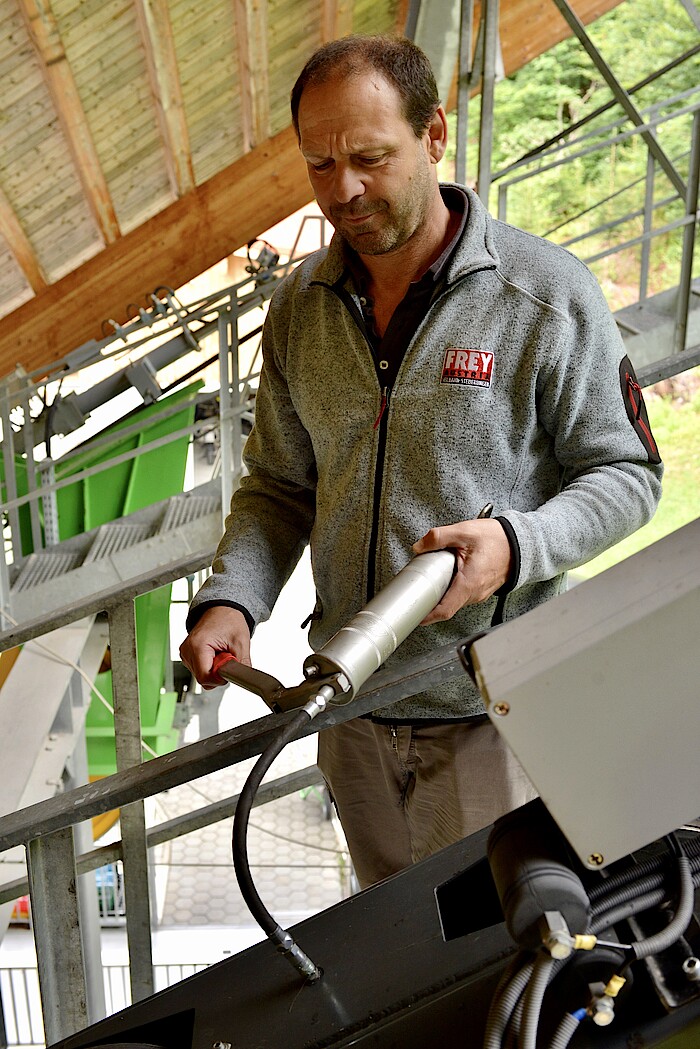 Nach einer Lehre als Industriemechaniker und zwei Anstellungsverhältnissen in der Branche führte eine längere Auslandsreise zur Neuorientierung: „Ich hab‘ 1994 in der Bauphase angefangen, hab‘ also die Eröffnung der neuen Bahn miterlebt.“ Seine Berufsbezeichnung sei „Seilbahnangestellter“, es gebe bei ihnen niemanden, der nur als Bergbahnführer arbeite. „Von unseren neun festen Leuten, im Sommer kommen zwei Kolleginnen für die Kasse dazu, müssen alle Alles betreuen können: die Parkplätze, Ticketverkauf, Einlasskontrolle, Kabinendienst, Wartung sowie Winterdienst“. Die Mitarbeitenden sind nicht nur für die Betreuung des Schlepplifts und die Präparierung der Piste verantwortlich, sondern auch für die Instandhaltung und Verkehrssicherung der Wanderwege zum Berggasthaus und zum Aussichtspavillon. Insgesamt sind das gut 1,5 Kilometer – im Sommer schon eine lange Strecke, im Winter eine Herausforderung.