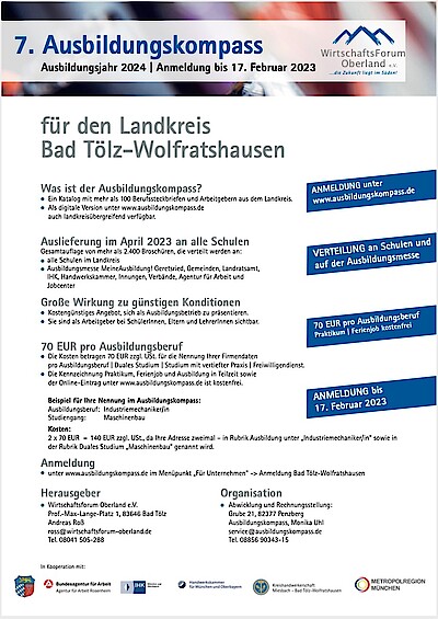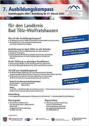 Hier schließt eine Kooperation die Lücke: das Wirtschaftsforum Oberland, mit dem Landkreis Bad Tölz-Wolfratshausen, der Industrie- und Handelskammer für München und Oberbayern, der Handwerkskammer für München und Oberbayern, der Kreishandwerkerschaft Miesbach-Bad Tölz-Wolfratshausen sowie die Agentur für Arbeit bringen die 7. Auflage des "Ausbildungskompass" heraus. Die kostenlose Broschüre ist sowohl gedruckt erhältlich als auch online abzurufen und soll Jugendlichen bei der Orientierung helfen.