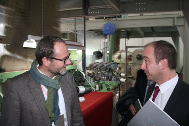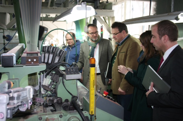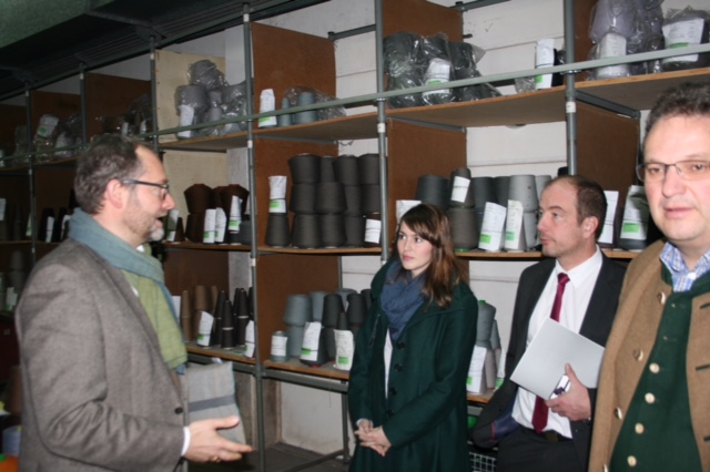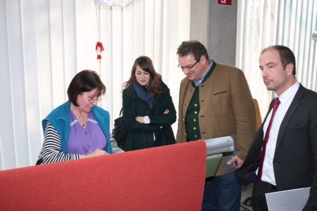 Geretsried, 13.2.2015 – Im vergangenen Jahr erhielt das Unternehmen Rohi Stoffe GmbH, das Wollstoffe und Sitzbezüge entwickelt, den Wirtschaftspreis des Landkreises. Grund genug für Landrat Josef Niedermaier, den Geretsrieder Bürgermeister Michael Müller sowie die Wirtschaftsförderer Annette Hilpert und Andreas Roß, sich die Produktionshallen und Designlabors einmal vor Ort anzuschauen.