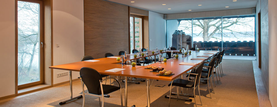 Die exponierte Lage des Hotels ermöglicht ein „Tagungskonzept mit Weitblick“, wie es Direktor Martin-Luis nennt. Das heißt, der große Tagungsraum neben dem Tagesrestaurant im Obergeschoss verfügt über ein ausgeklügeltes Licht- und Frischluftsystem. Über einen sogenannten „Skyframe“ fällt der Blick über den See. Fenster und Balkone ermöglichen optimale Frischluftzufuhr und lassen quasi die Natur in den Raum.