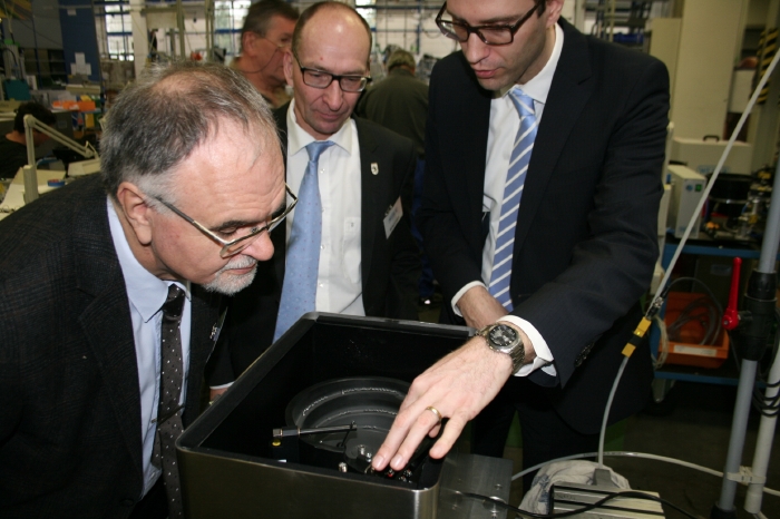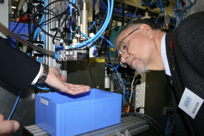 Den 58-jährigen CSU-Stadtrat interessierte zudem, inwiefern bei Weber technische Sauberkeit gewährleistet ist. Marketing-Leiter Steidl verwies darauf, dass durch Einsatz vibrationsarmer Zuführtechnik und einer der Schraubspindel vorgelagerten Schmutzbremse Verunreinigungen in der kritischen Größe von 200 – 400 μm von 125 Partikel auf 19 Partikel reduziert werden können. „Technische Sauberkeit wird bei uns groß geschrieben. Die Vakuumeinheit der Geräte wirkt wie ein Staubsauger“, erklärt Steidl.