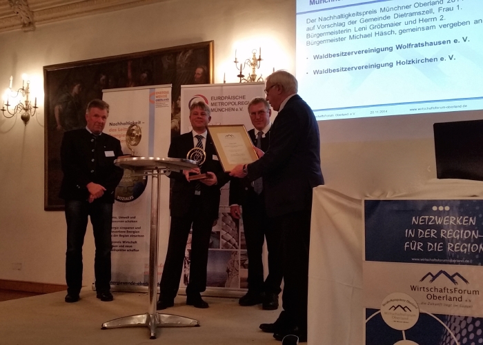 Benediktbeuern, 22.11.2014 -Das Wirtschaftsforum Oberland hat am Donnerstag zum vierten Mal regionale Unternehmen mit dem Nachhaltigkeitspreis Münchner Oberland ausgezeichnet. Anders als im Vorjahr, als allein der Geretsrieder Gaslieferant Tyczka Totalgaz gewürdigt wurde (wir berichteten…), entschied sich der Aufsichtsrat des Wirtschaftsforums heuer für gleich zwei Preisträger: die Waldbesitzervereinigungen Wolfratshausen und Holzkirchen sowie die Moltke Unternehmensgruppe GmbH, der das Parkhotel Egener Höfe gehört.