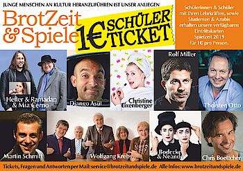 Schülerinnen und Schüler der weiterführenden Schulen der Region und ihre Lehrkräfte sowie Studenten und Azubis aufgepasst: Sie alle können in der Saison 2019 erstmals zu allen Vorstellungen der Reihe „BrotZeit&Spiele“ Eintrittskarten zum symbolischen Preis von 1 Euro pro Schüler, Lehrkraft, Azubi oder Student erhalten.