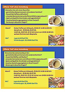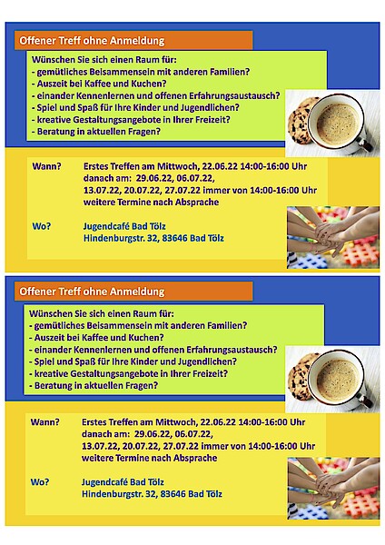 Die Tölzer Jugendförderung bietet jetzt eine Anlaufstelle für Menschen mit Fluchthintergrund: Gemeinsam mit dem Verein Camino e.V. sind Betroffene eingeladen in die Räume des Jugendcafés in der Hindenburgstraße 32 in Bad Tölz: Jeden Mittwoch zwischen 14 und 16 Uhr zu einem gemütlichen Treffen bei Kaffee und Kuchen. Das Angebot ist zunächst bis zum Beginn der Sommerferien geplant.