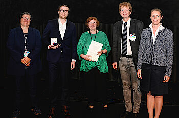 Prof. Dr. Gerhild Becker, Jurypräsidentin / Sebastian Snela, 1. Vorsitzender Stiftung Domicilium e.V. / Mag. Phil. Psych. Helena Snela, Leiterin Hospiz-Gemeinschaft / Prof. Dr. Lukas Radbruch, DGP-Präsident / Myriam Heine, Medical Director des Geschäftsbereichs Deutschland der Grünenthal GmbH (v.l.n.r.) Foto: DGP/KT