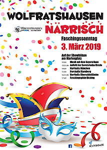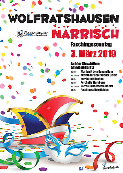 Die Faschingszeit wird gerne auch die fünfte Jahreszeit genannt. Dieses Jahr gibt es sie auch wieder in Wolfratshausen. Am 3. März 2019 darf man sich auf ein buntes Faschingstreiben im Markt und am Marienplatz freuen. WOLFRATHAUSEN wird wieder NARRISCH.