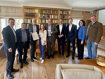 Foto, von links: Dr. Bernd Hochburgen (Vorstandsmitglied Stadtparkasse München), Landrat Erwin Schneider (Lkr. AÖ, 1. Vorsitzender Bezirksverband), Andreas Frühschütz (Vorstandsvorsitzender Kreissparkasse München-Starnberg-Ebersberg, Bezirksobmann), Verena Schlecht (Geschäftsführerin des Musikbundes von Ober- und Niederbayern e.V.), Josef Niedermaier (stv. Vorsitzender des Bezirksverbandes und Präsident des Musikbundes von Ober- und Niederbayern e.V.), Andreas März (OB Stadt Rosenheim), Roger Pawellek (Vorstandsvorsitzender Kreissparkasse Traunstein), Renate Waßmer (Vorstandsvorsitzende Spk. Bad Tölz-Wolfratshausen), Stefan Schelle (1.BGM Gemeinde Oberhaching)