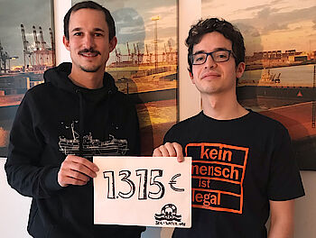 Geretsried-Gelting, 15.3.2020 - Bei dem Benefizkonzert (Ende Februar) in der Kulturbühne Hinterhalt, organisiert von der Grünen Jugend des Landkreises, kam der stolze Reinerlös von 1.315 Euro zusammen. Der Spendenbetrag geht zu Gunsten der zivilen Seenotrettung SeaWatch. Benedikt Funke und Jimi Tammelleo (Bild v.l.) übergaben kürzlich den Spendenbetrag an die Hilfsorganisation. „Leider konnten wir uns über unseren kleinen Erfolg kaum freuen, weil inzwischen die Lage an der griechischen Grenze eskaliert ist.“ Die Grüne Jugend fordert den Landkreis sowie die Kommunen auf, sich als "sichere Häfen auszurufen!“
