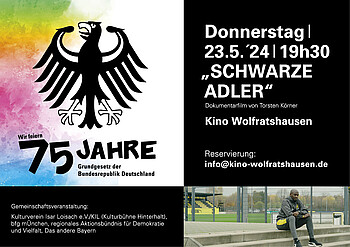 Im Anschluss zeigen wir – aus aus unserer Sicht gegebenem Anlass - den Dokumentarfilm „Schwarze Adler“ von Torsten Körner („Die Unbeugsamen“) im Beisein eines der Protagonisten (angefragt). Der Film ist ein Dokument über die Erfahrungen und Eindrücke der ersten Fußballer/innen mit schwarzen Haaren, schwarzer Hautfarbe, die für die deutsche Nationalmannschaft im Trikot mit dem Schwarzen Adler spielten...und was da wohl los gewesen ist in den Stadien?! Was ein Waschmittelkarton der Marke „Persil“ damit zu tun hat, was „weißer Blick“ bedeuten könnte. Eine Gemeinschaftsveranstaltung des Kulturverein Isar Loisach (KIL), der Kulturbühne Hinterhalt, Das andere Bayern, bfg mÜnchen, Regionales Bündnis für Demokratie und Vielfalt. Reservierung ausschließlich über info@ ; Eintritt Kinotarif (zu entrichten vor Ort im Kino), Begrüßungsgetränk und Geburtstagskuchen im Eintrittspreis mit inbegriffen! kino-wolfratshausen.de