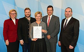 Die Präsidentin des Bayerischen Hotel- und Gaststättenverbandes DEHOGA Bayern, Angela Inselkammer (li.), und Bayerns Wirtschaftsminister Hubert Aiwanger (re.) zeichneten den Leiter der touristischen Abteilung Daniel Weickel, Qualitätscoach Silke Krammer und Bürgermeister Thomas W. Holz (v. li.) aus.