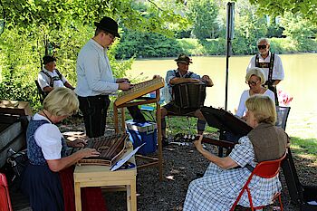 Die bairische Hausmusik fügte sich perfekt ins idyllische Landschaftsbild ein. Einige brachten sogar selbst ihr Instrument mit und gesellten sich zu den unter einer Linde sitzenden Musikanten. So ertönten bei freiem Eintritt Hackbrett, Zither, Steirische Harmonika und Gitarre. Dabei achteten
