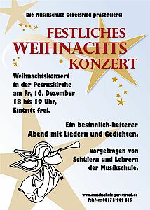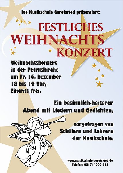 „Wir sagen Euch an, den 4. Advent“… am Freitag, 16. Dezember findet das Festliche Weihnachtskonzert der Musikschule Geretsried von 18 bis 19 Uhr in der Petruskirche Geretsried statt. Mit dabei sind heuer erstmals auch die Schüler der Bläserklasse des Gymnasiums Geretsried, eine Kooperation mit der Musikschule. Das Programm besteht aus vielen Ensemble- und Solobeiträgen der Musikschüler, aufgelockert durch besinnliche und unterhaltsame Geschichten und Gedichte.