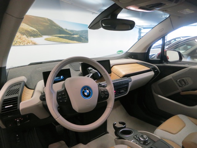 Der Kofferraum kann durch die umklappbare Rückensitzlehne von 260 l auf ein Ladevolumen von 1100 l vergrößert werden. Ein kleiner Zusatzstauraum befindet sich unter der Frontklappe. Der Elektro-BMW ist durch die Batterien im Fahrzeugboden von seiner Bauform relativ hoch, also vergleichbar einem SUV. Von daher bietet der i3 dem Fahrer und Beifahrer einen weitläufigen und gut sichtbaren Überblick.