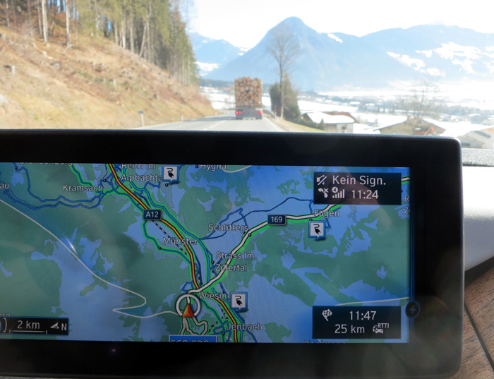 Über die Landstrassen des Oberlands fahren wir gemütlich, aber zügig wie der übrige Verkehrsfluss, immer in den Tempolimits von 70, 80 oder 100 km/h. Und siehe da, die vom i3 angezeigte Restreichweite im Elektrobetrieb fällt weniger, als die vom Navi angezeigte Reststrecke. Das heißt, wir verbrauchen weniger Strom als geschätzt, entweder weil der i3 einfach die Reichweite konservativ berechnet oder wir sind schon ganz gut geworden, bewusst und energiesparend zu fahren. Zugegeben, wir nutzen, wann immer möglich, ausschließlich die Bremswirkung des e-Motors, statt aufs Bremspedal zu treten. Dabei gewinnen wir beim Verzögern oder Abwärtsfahren Energie zurück, statt an den Bremsen zu schleifen. So soll’s sein. Besonders die Achenpass-Abfahrt macht Laune, denn hier steigt die Restreichweite durch die Rekuperation kontinuierlich an. Als wir an unserer Zieladresse in Zillertal ankommen, haben wir tatsächlich noch 16 km Reichweite über.