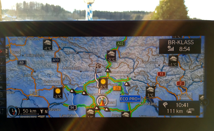 Als erstes haben wir uns ein Ziel vorgenommen, das von uns aus gerade im Grenzbereich der vom i3 im Voraus berechneten Reichweite im reinen Elektrobetrieb beim verbrauchsoptimierten Fahrmodus EcoPro liegen sollte, nämlich 116 km: Zillertal in Österreich. Von Eurasburg über Bad Tölz, Lenggries und den Achenpass ist die im Navi eingegebene Strecke genau 116 km. Wir fahren gespannt los, wohl wissend, dass wir mit dem vorhandenen Range Extender immer noch 100 km weiter fahren könnten, falls uns die volle Batterieladung ausgehen sollte.