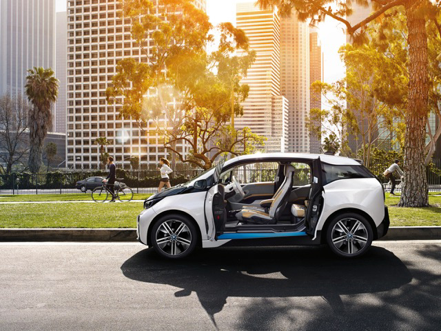 Das neue Elektroauto BMW i3 ist mit gerade einmal vier Meter Länge ein kompaktes Auto, etwa von der Größe eines VW Golfs. Das Erste was auffällt beim Einsteigen sind die großen Türen und die relativ hohe Sitzposition. Außerdem hat das Auto keine mittlere Tür-Säule (B-Säule), weil die hinteren Türen entgegen der Fahrtrichtung zu öffnen sind. Das erleichtert den Zugang zu den Rücksitzen, auch wenn die vordere Türe zuerst geöffnet werden muss. Das Raumgefühl ist insbesondere vorne sehr großzügig, unter anderem weil es im Fußraum keine Mittelkonsole gibt. Aber auch die Fahrgäste hinten kommen vom Raumangebot her nicht zu kurz.