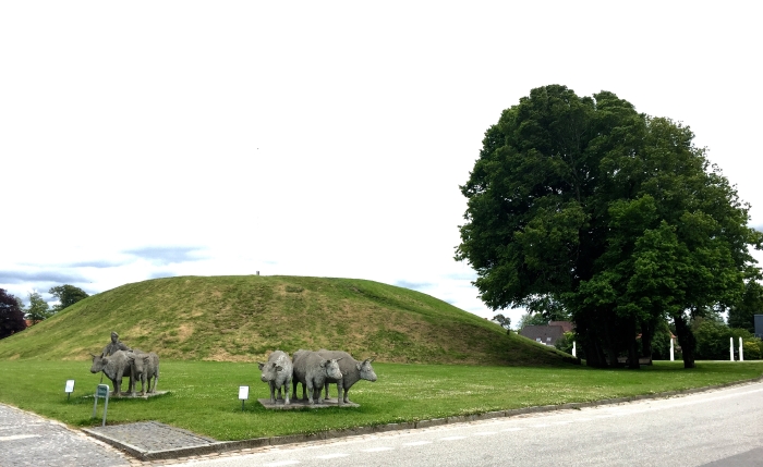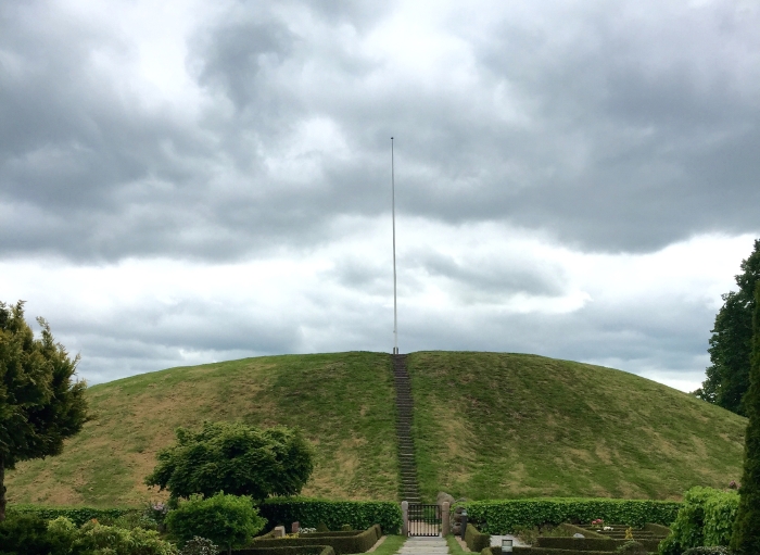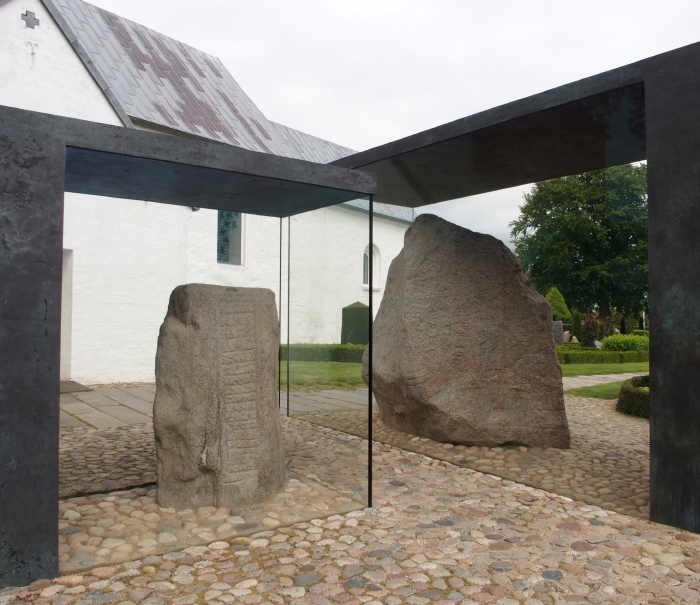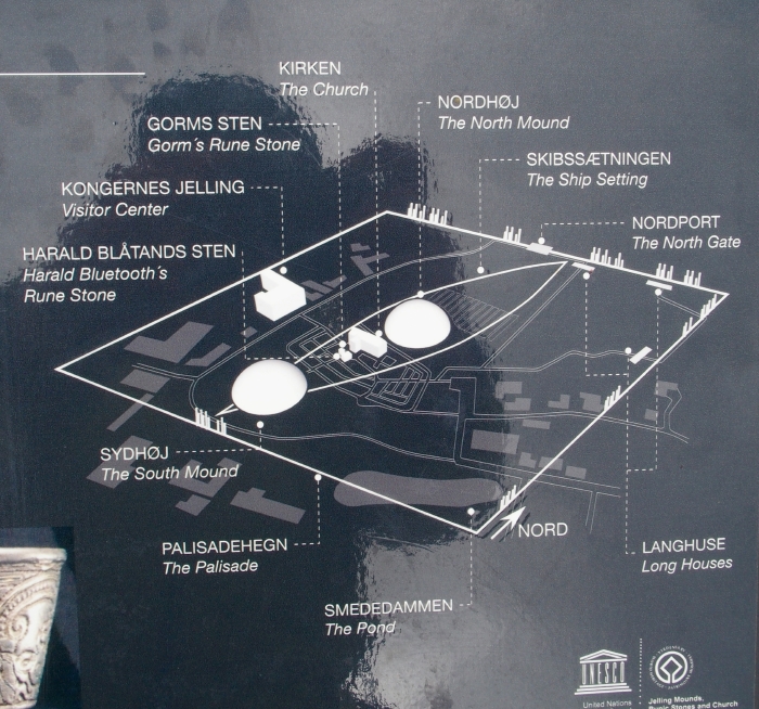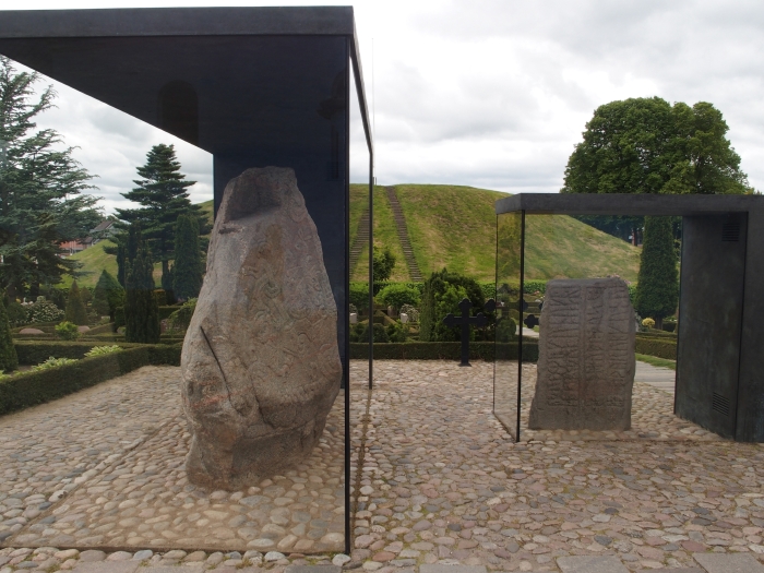 Jelling ist ein kleiner, auf den ersten Blick eher unscheinbarer Ort mit knapp 3500 Einwohnern, der jedoch auch „das königliche Jelling” genannt wird, weil sich dort einer der bedeutendsten archäologischen Fundorte Dänemarks befindet. Hier zeugen neben einer Steinkirche aus der Zeit um 1100 nach Christus zwei große Grabhügel und zwei Runensteine vom Kulturwandel und der Einführung des Christentums in Dänemark. Es sind die Grabstätten des ersten Königs von Dänemark, Gorm der Alte, und seiner Frau Thyra, die um 910 nach Christus gelebt haben. Ihr Sohn Harald Blauzahn, zweiter König von Dänemark, ließ einen großen Grabstein für seine Eltern errichten, auf dem er von sich selbst sagt: „König Harald befahl diesen Stein zu errichten, zum Gedenken an Gorm, seinen Vater, und an Thyra, seine Mutter. Der Harald, der ganz Dänemark und Norwegen unterwarf und die Dänen zu Christen machte.” Der große Stein, „Jellingstein“ genannt, steht heute noch perfekt erhalten an seiner ursprünglichen Stelle, obwohl seit ein paar Jahren leider in einem großen Glaskasten, um ihn vor Graffiti zu schützen.