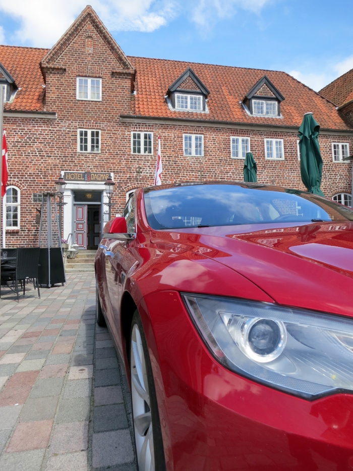 Deshalb verbringen wir auch noch einen zweiten Tag in Ribe und genießen das Nordseeklima bei einer kurzen Ausfahrt zur Schleuse 10 Kilometer westlich von Ribe, wo der Fluß „Ribe Å” ins Wattenmeer fließt. Nachmittags machen wir einen Rundgang durch die kleinen schmalen Gässchen von Ribe und essen dabei das landestypische Softeis, während der Tesla an der Ladestation von „Clever“ seine Batterien auflädt. Denn am nächsten Morgen wollen wir die Heimreise von 1070 Kilometern ins Bayerische Oberland starten, und auch diese Strecke mit dem Elektroauto in nur einem Tag zurücklegen.